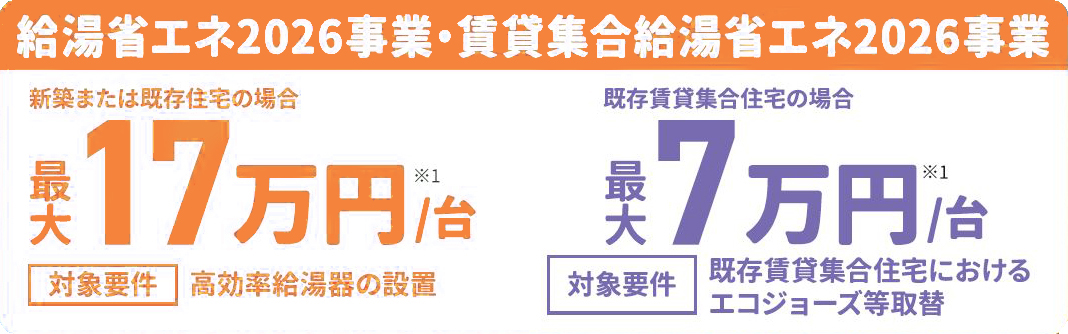 ※「先進的窓リノベ2025 事業」は必須工事①(開口部の断熱改修)として、「給湯省エネ2025 事業」および「賃貸集合給湯省エネ2025 事業」は必須工事③(エコ住宅設備の設置)として扱われます。