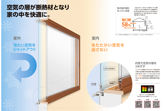 既存の窓と内窓の間に空気層が生まれることで、外部の冷気を防ぐ断熱材の様な役割を果たしてくれます。